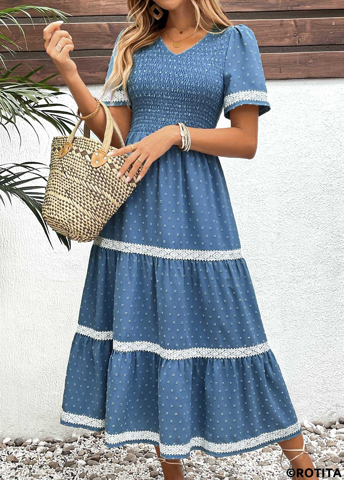 • Dusty Blue dresses,Plain Color dresses,Everyday dresses,Casual dresses,ROTITA Embroidery Dusty Blue V Neck Short Sleeve Dress