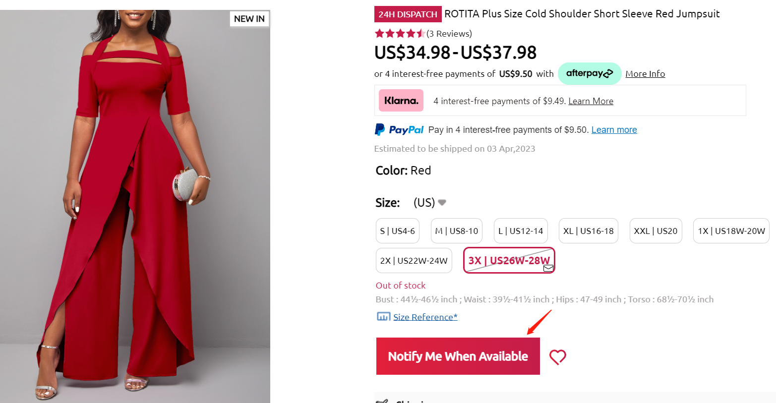2) Wenn Sie eine 3X (US26W-28W) wie unten gezeigt bestellen, bedeutet dies, dass sie jetzt ausverkauft sind, aber dass eine Nachlieferung für die Zukunft geplant ist. Sie können sich anmelden, indem Sie unten auf die Größe klicken, und Sie erhalten eine E-Mail, sobald sie verfügbar ist.