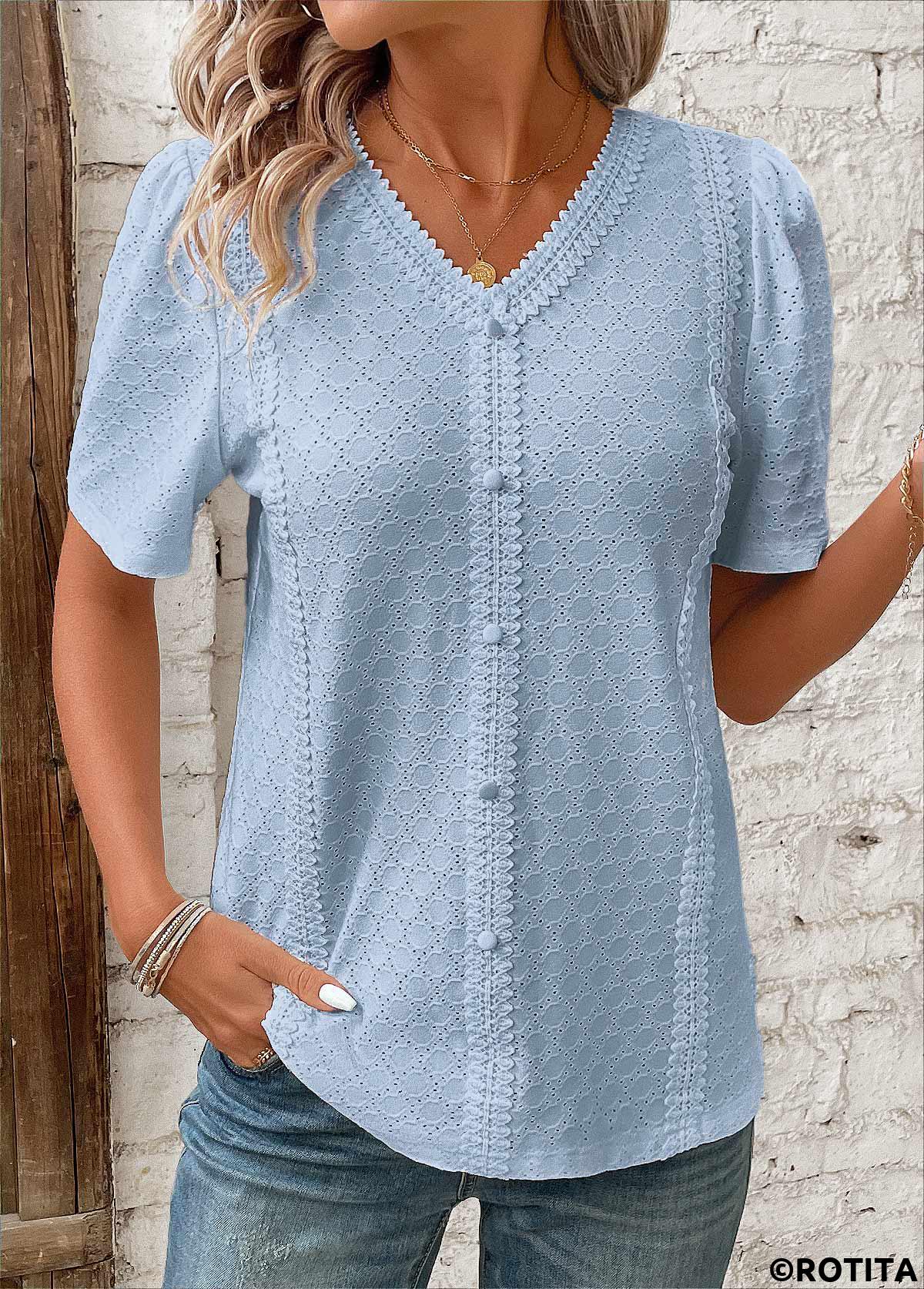 Home  >  Tops  >  Blouses  >  ROTITA Patchwork Blue V Neck Short Sleeve Blouse